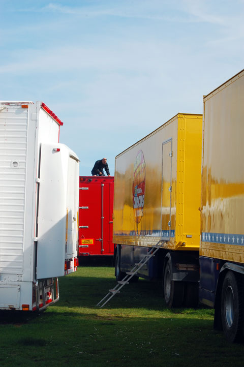 Whilst out on a recent photoshoot I came across this little domestic narrative. What first drew me to the potential of a shot was the bold shapes and colours of the lorries and then the guy on the roof caught my attention. He went from one lorry to the next with brush and pan in hand and swept each in turn. From what I could see from ground level all the vehicles were impecably clean and a credit to their owner, perhaps their was something in the last shower of rain that I wasn’t aware of !