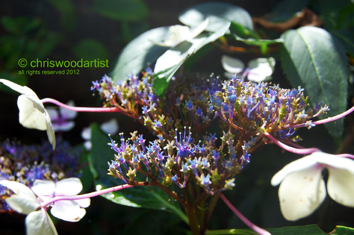 “Lace cap Hydrangea serrata Blue Bird” © chriswoodartist all rights reserved 2012. This poor specimum has got a little straggly due to a lack of light – I love those blue, allien like flowers. Following on from this mornings exigencies, when my good lady and I filled another 8 bags with prunings, I fear another pilgrimage to the local dump will on the agenda tomorrow – for now though – I’m off to the studio !
