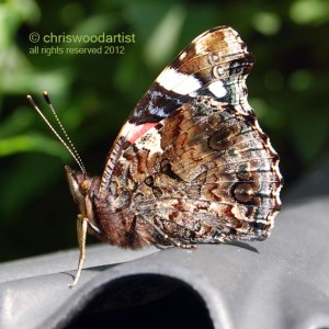 “The modest Vanessa atalanta” (Red Admiral) © copyright chriswoodartist all rights reserved 2012. Having tidied up my decking, swept the paths, pruned the bushes, bagged the rubbish and watered the garden -I celebrated by taking a couple of quick photos . I tried to persuade this chappy to open his wings but he wasn’t having any of it and basked in the sun – sitting there on the roof of my bird table – which is now visible and no longer swathed in winter jasmin ! I usually have hundreds of butterflies in the garden but I cut the buddleia down to the ground last autumn and this year it’s been sulking and its not produced any flowers.
