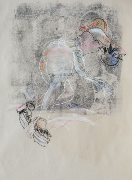 “Ruby’s New Shoes” Mixed Media Drawing : Mono print, chalk, charcoal & pastels. © copyright chriswoodartist all rights reserved 2012