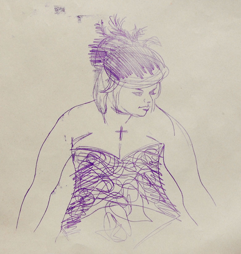 “Ruby with Feather Hat & Corset” Monoprint. © chriswoodartist all rights reserved 2012