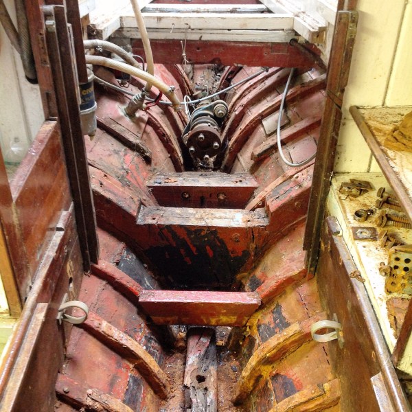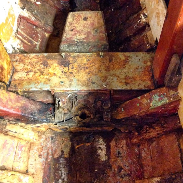 Galvanised iron support for deck stepped mast (in tabernacle). Note the remains of the old keel stepped mast – when the keel came off the mast step broke off as the keel bolt and surrounding rot had compromised the strength of the 80 year old timber.