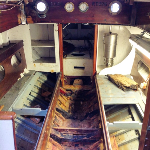 The interior before it gets taken out to allow further access to the frames and floor timbers. NB The timber on the starboard bunk is the remains of the rotted mast step