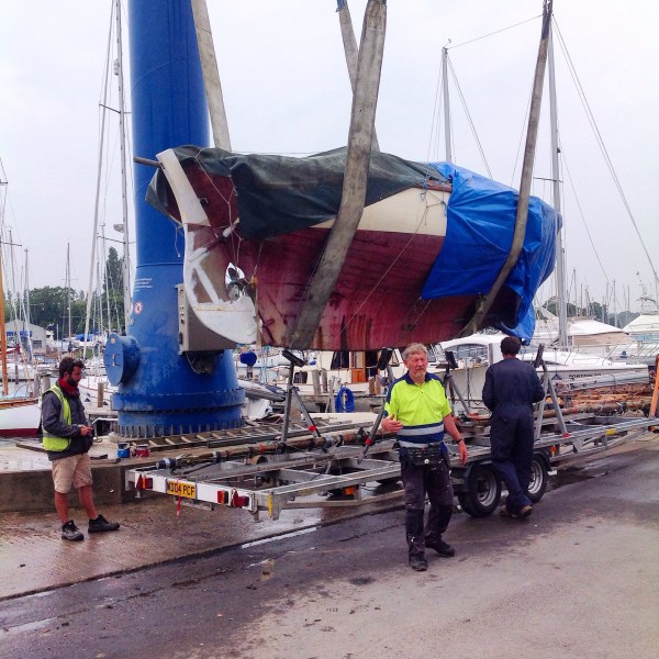 Tim Cath of Bosham Boatyard delivered the boat to Birdham Pool Marina and here he is removing the strapping prior to the boat being lifted off his flatbed trailer.