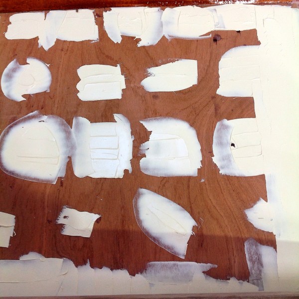 Two coats of Teamac Metaclor underwater primer, followed by three coats of white undercoat and the topsides are getting there – just a light sanding plus a few little dings need filling, then more undercoat, followed by a coat of 50% enamel / 50% undercoat, then two coats of enamel.
