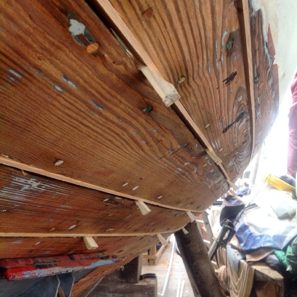 Repair to end of port garboard. A nice recycled piece of pitch pine. All old fastening holes are pegged with the same piece of pitch pine.