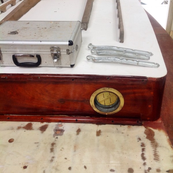 She is beginning to look a little more wholesome 30.7.19. The chain plates have been dry fitted, the quadrants around the cabin sides have been fitted and the fastening holes, plugged with matching mahogany plugs, sealed and varnished and a coat of Teamac Metaclor Underwater primer has been applied to the bottom, which had been professionally “pealed” (well worth the money as it to saved a lot of time and effort).