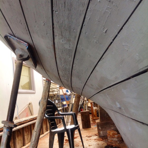 Scary photograph with the garboards removed for repairs and priming. Copyright Chrisnwood All rights reserved