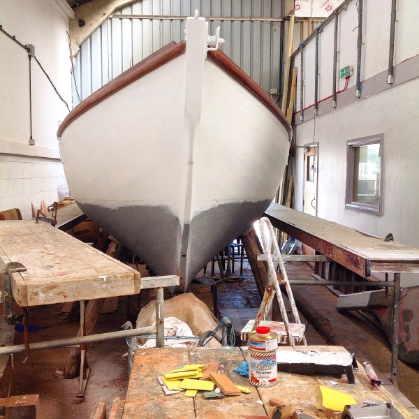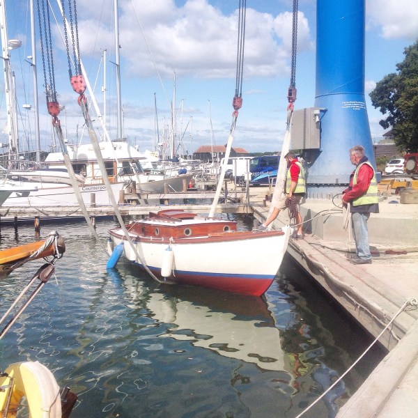 A slightly better set of fenders and here we see the boat floating a tad high – before the chain and moveable ballast was put back. She still floats a bit high but the mast has yet to be slotted in and the engine is still in the workshop too !