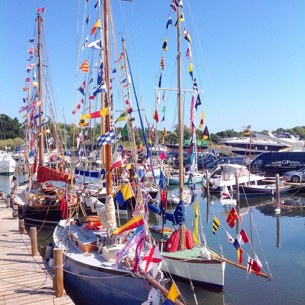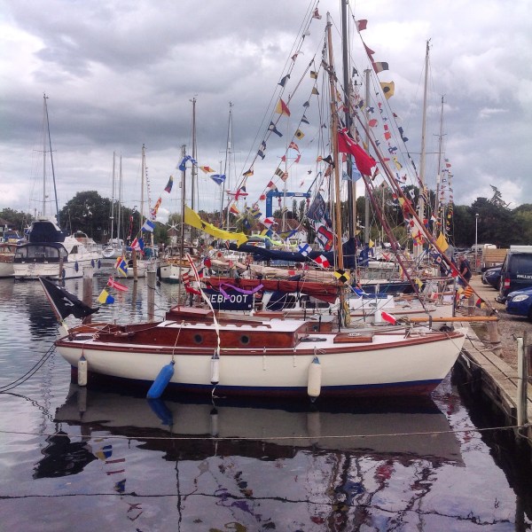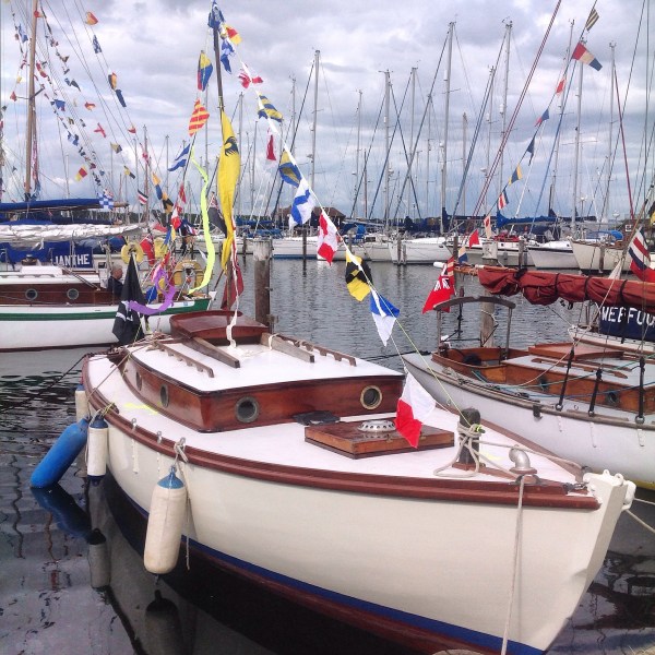 And here she is at the Birdham Pool Marina Classic Boat Festival 7th/8th September. As the new  mast is still in the workshop, I lashed two boat hooks together to support my rag tag collection of flags – the hull is “taking up” nicely (meaning the planks are expanding and the leaks are less of a concern) and last nights leakage amounted to 30 pumps of the Whale Chimp Handpump ! Many thanks to Richard of TimGilmoreLtd for pumping her out his morning !
