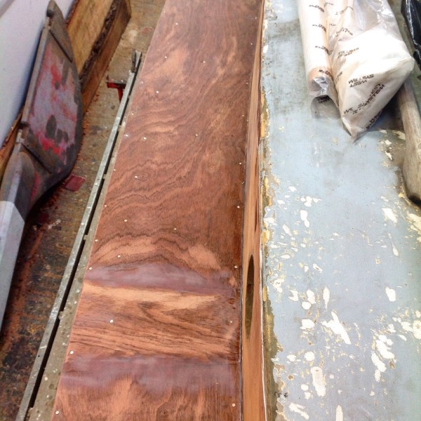 Progress is occurring thick and fast ! Both rub rails are made and stuck to the top strake with Sikaflex before being screwed, countersunk and plugged with mahogany plugs which are sanded and the whole rail sealed. The rails are left long (overlapping the transom) then cut down to size, rounded and sealed.