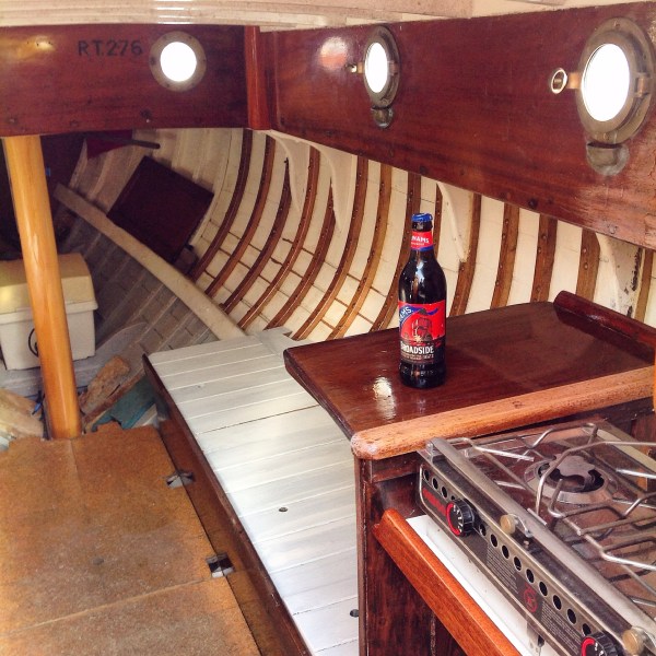 The galley, chart table, bottle of Adnams Broadside, and my bunk which has changed colour – no more battleship grey – the white undercoat will morph into cream yacht enamel. Since taking this photo, the splines, in between the topside planks, have been treated to their first coat of undercoat.