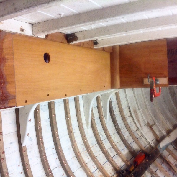 New quarter knee tying the new top of the transom to the side of the boat. NB : It was painted prior to final fitting as it will be inaccessible later – after layers of new aft deck and the diesel tank has been refitted etc !