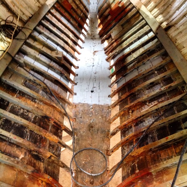 Devoid of her interior, and badly degraded Floor Timbers Leading Wind is ready for some new oak replacements.