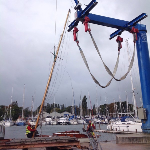 Leading Wind looking smug and reunited with her 1.5 ton keel. She sat there for an hour whilst the other boats were manoeuvred into the shed and were parked and propped up with shores and wedges.