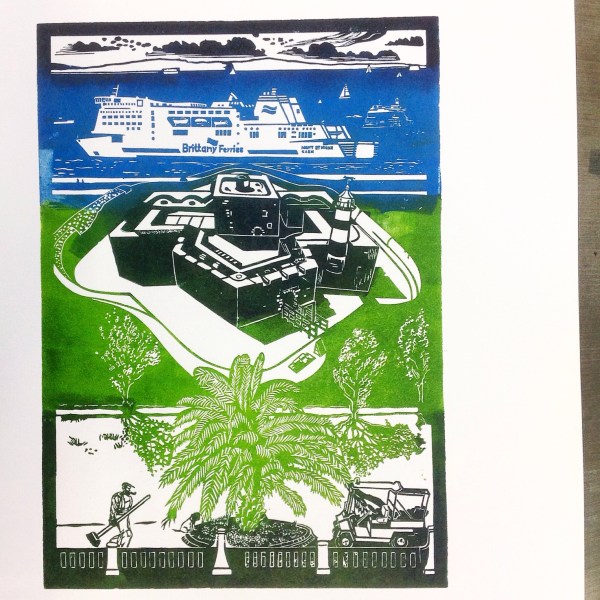 “Ship & Castle” (with HM Naval Dockyard, HMS Warrior and AC45’s leaving port for a days racing) Limited Edition Lino Cut © Chris N Wood www.chriswoodartist.com All rights reserved 2015 site size of lino block :