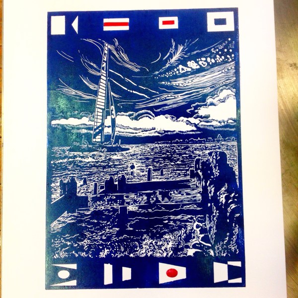 “BAR Passing E Cowes” Limited edition hand pulled lino cut printed on snowden cartridge 500x700mm Copyright Chris N Wood All Rights Reserved – available from Jack House Gallery High St Old Portsmouth